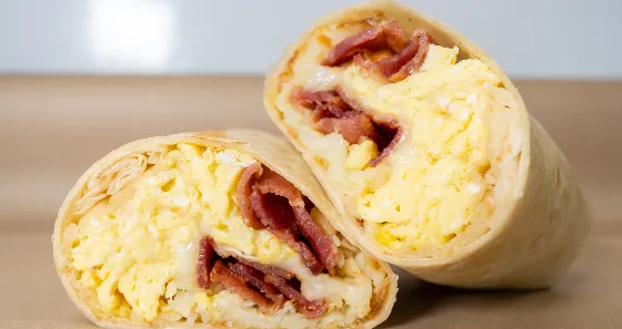 Just what the house ordered. Golden crispy buttery hash brown, 3 soft scrambled eggs, 3 pieces of hickory smoked bacon strips, melted shredded jack cheese, and wrapped in a warm fluffy flour tortilla.