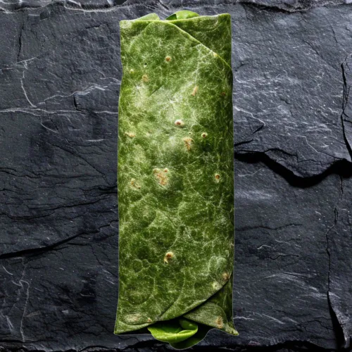 Spring Mix Lettuce, Shredded Carrots, Shredded Cabbage, Wonton Strips, Green onion and Black Sesame Seeds wrapped in a spinach flour tortilla.